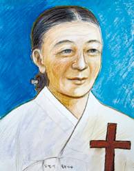 | ▲ 궁녀들과 묵주신공을 바치고 있는 김연이 율리아나. 탁희성 화백 그림 |